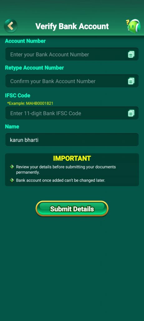 helo dosto is Application me apna Acount jodne ke liye sabse pahle Is Application me aapka rejistrat hona hai uske bad Apke app ke open karna hai jab aap app ko open kijiyega to open Application ke Left said me bank ka opsan hoga us par click kariyega to Add bank account ka option dikhai dega us par jab Aap tach kijiyega to Bank account number aur IFSC code mangega to dal kar Aap apna Acount Add kar sakte hai